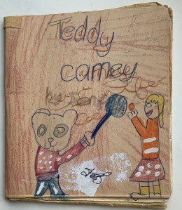 When I was seven. It was completely magpied from a book I loved to re-read when I was this age: About Teddy Robinson by Joan Robinson. Mine was called About Teddy Carney. The teddy lost his leg, played tennis and got a cap with the number 88 on it. Deep.