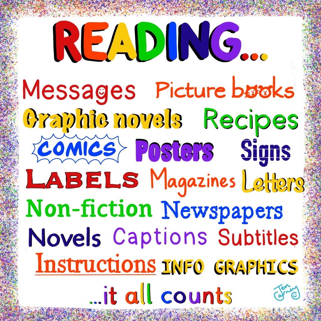 Forego reading scheme books now and then in favour of visiting the library, buying a comic/magazine to share, or introducing your child to a funny book you know will make them laugh (This was a game-changer for us – I’ve blogged about it here). Remember, variety is the spice of life and ALL READING COUNTS!