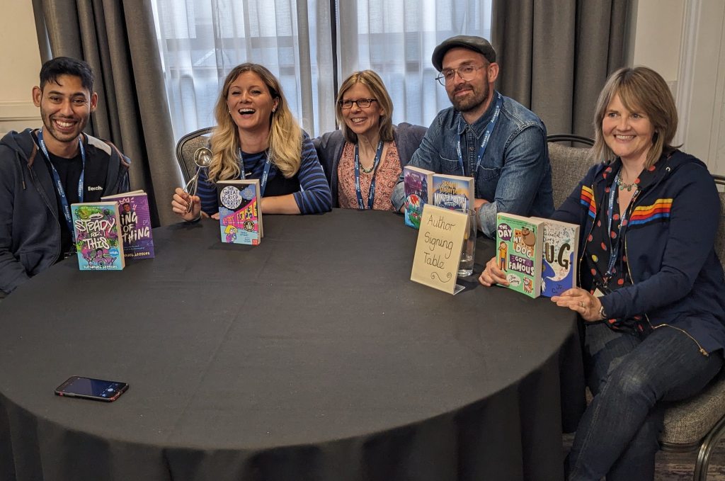 I really enjoyed taking part in the ‘Funny Fiction’ panel at the YLG conference in Glasgow recently. Chaired by super-librarian, Jenny Hawke (centre), the panel included, from left to right: Nathaneal Lessore – amazingly talented author of Steady for This, Pamela Butchart – super-funny author of the Izzy series of books, Martin Stewart, multi-talented author of The Bridget Vanderpuff series, and me!